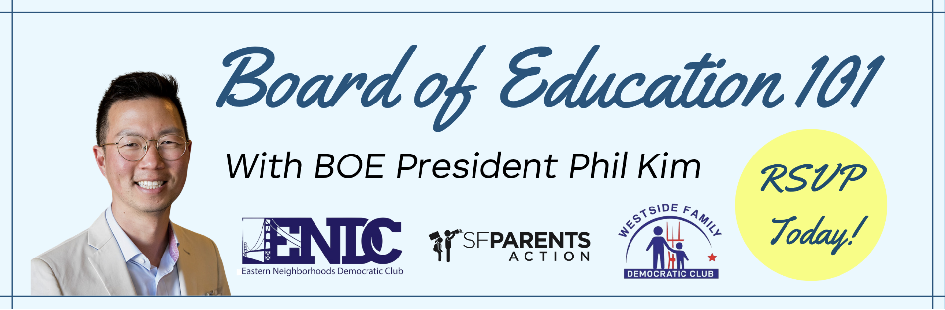 Families deserve to know how the Board of Education works and why it matters for SFUSD students. Join us on Wednesday, October 22 at 8 pm on Zoom for a session covering the basics and what you need to know, followed by a Q&A with Board President Phil Kim. Bring your questions and get a clearer picture of how board decisions shape our schools. Co-hosted between SF Parents Action, ENDC, and Westside Family Democratic Club.